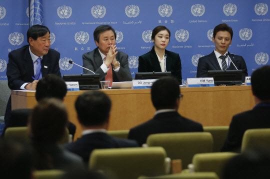 2018년 평창동계올림픽 정부대표단이 13일(현지시간) 뉴욕 유엔본부에서 기자회견을 하고 있다.