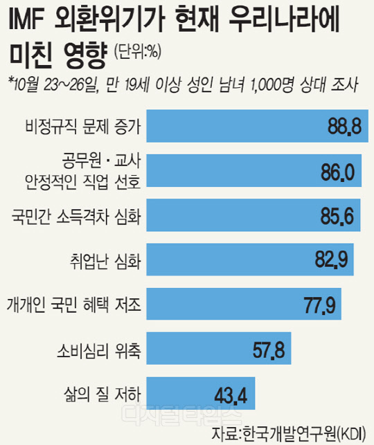 또한 외환위기가 현재 한국에 끼친 영향을 묻는 질문에는 88.8%가 비정규직 문제라고 답했다. 86.0%는 외환 위기가 공무원·교사와 같은 안정적인 직업 선호 경향을 초래했고, 85.6%는 국민간 소득 격차를 키웠다고 분석했다. 취업난을 심화시켰다는 비율도 82.9%에 달했다.