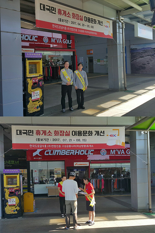 이완영 휴게소장은 "2016년 취약구역인 화장실 개선사업을 통한 1차 아름다운 화장실 만들려고 하였고, 2017년 들어 캠페인을 통한 동의 고객들의 명부 작성을 통한 고객들의 다짐으로 자발적인 동참을 이끌어 내고자 하였습니다."라고 말했다.