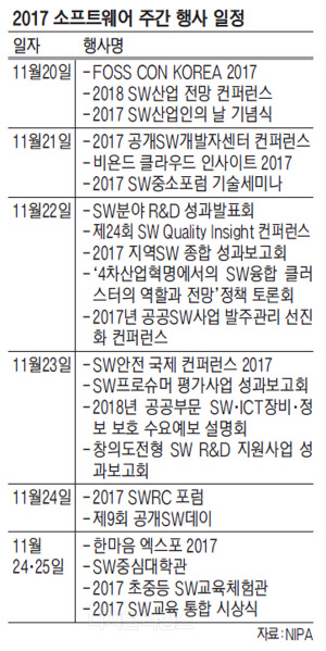◇공개SW 개발자 한자리에=공개SW 기술 역량을 강화하고 저변을 확대하기 위한 행사도 다채롭게 열린다. 공개SW 라이선스에 대한 인식과 활용방안을 공유하기 위한 '글로벌 콘퍼런스(FOSSCON코리아2017)'에서는 공개SW 전환과 거버넌스 구축에 따른 국내외 시장진출 사례와 핵심 전략이 논의된다. 공개SW개발자센터 프론티어와 커뮤니티에서 개발하는 프로젝트 지식을 공유하는 '2017 공개SW개발자센터 콘퍼런스(KOSSCON)'도 눈여겨볼 만하다. 공개SW 개발자대회와 공개SW산업발전 유공자 표창, 오픈소스 콘퍼런스 등 한 해 공개SW 성과를 되돌아보는 '공개SW데이'도 열린다.
