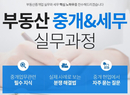 강의는 수강 시작일로부터 60일간 수강할 수 있으며, 중개실무 10강과 세무실무 6강으로 구성됐다. 자세한 사항 및 수강신청은 홈페이지를 통해 가능하다.