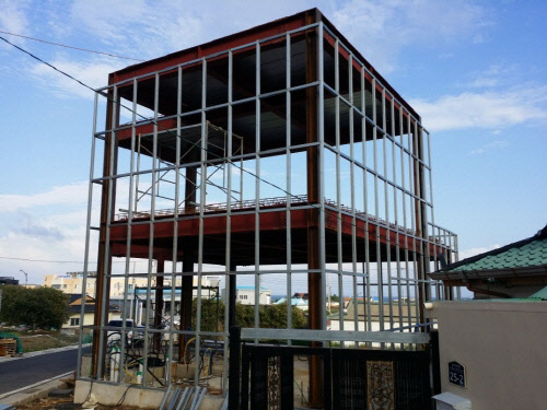 바로 내진강화건설자재생산 벤처기업인 (주)엠베스텍에서 특허 출원한 '내진강화거푸집'을 사용하여 건축한 주택이다. 이 주택은 H빔을 기본으로 한 철골조 구조에 레미콘 콘크리트 구조의 벽체로 마치 철갑을 두른 듯한 외형을 보여주고 있어 보는 이들의 눈길을 끈다.