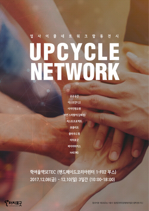 '업사이클 네트워크' 전시는 △공공공간 △이스트인디고 △이자인원오원 △'자연'스러웠어 △져스트프로젝트 △큐클리프 △클라우드잼 △파이어마커스 △혜(HAE) 등이 터치포굿과 함께 한다.