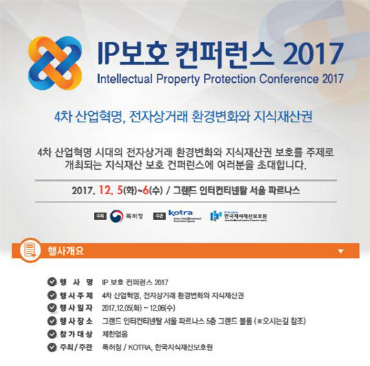 이 행사는 4차 산업혁명 시대 전자상거래 유통구조 변화에 따른 국내 기업의 IP 보호·활용 방안을 논의하기 위해 마련됐다. 행사는 지식재산권 전문가들의 정책토론과 중국 위조상품 유통 현황에 대한 특별강연, 아시아 지역의 전자상거래 환경변화 강연 등 세 개 세션으로 진행된다.