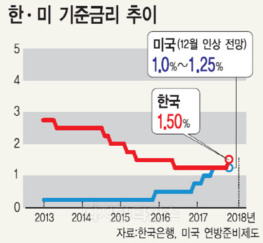 12월 추가 금리인상이 단행되면, 미국의 기준금리는 현 1.00~1.25%에서 1.25~1.50%로 올라 상단이 한국의 기준금리와 동일해진다. 한국은행은 지난 11월 금융통화위원회에서 기준금리를 1.50%로 인상한 바 있다. 한은은 미국이 12월 기준금리 인상이 확실시 되는 상황에서, 한미간 금리역전으로 인해 외국 투자자들의 자본유출 가능성을 선제적으로 막기 위해 금리인상을 결정했다.