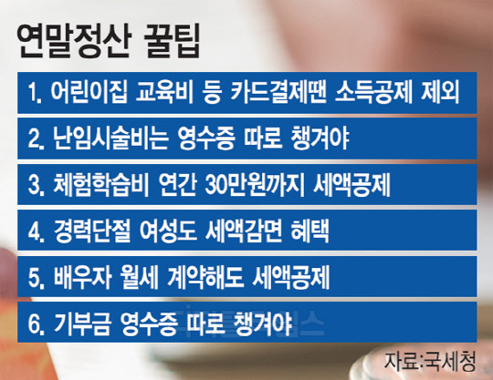 체험학습비 연 30만원 세액공제 … 배우자 월세 계약도 포함 어린이집 교육비 등 공제서 제외 난임시술비·기부금 영수증 챙겨야 경력단절 여성 중소기업 재취업땐 소득세 70% 감면…연150만원 한도
