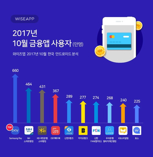 앱 분석기관 와이즈앱은 올해 10월 국내 안드로이드폰 사용자의 금융앱 사용 실태를 분석한 결과 삼성페이의 월실제사용자(MAU)가 660만여명에 달해 가장 많았다고 5일 밝혔다.