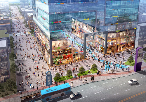 명지블루스퀘어도 일반적인 상가 형태에서 벗어난 오픈형 상가로 주목을 받고 있다. 건물 중앙에 폭 9m 넓이의 보행자 전용도로를 설계해 전 층, 전 호실의 노출면을 극대화했다.
