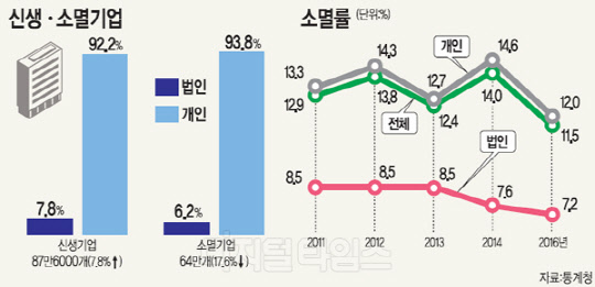이외에 2015년에 폐업한 소멸기업은 64만개로 전년보다 13만7000개(17.6%) 줄었다. 소멸기업의 74.0%는 매출액 5000만원 미만이었고, 92.0%는 종사자 수가 1명인 영세 사업장이었다.
