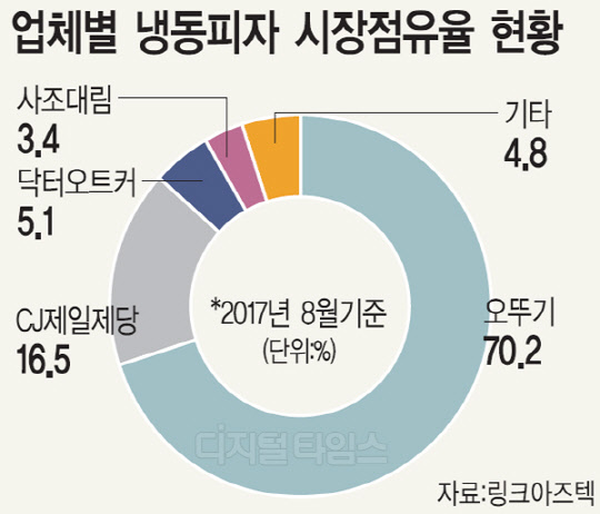그동안 국내 시장에는 소비자들 입맛에 맞지 않는 수입산 냉동피자가 주를 이뤘으며, 국내산 제품군도 적었다. 오뚜기는 이를 기회로 보고 국내 소비자 입맛에 맞는 냉동피자 제품군 확대에 주력했다. 올해(1∼10월) 오뚜기의 냉동피자 누적 매출은 700억원대로, 국내 냉동피자 시장에서 점유율 1위다. 오뚜기 관계자는 "치즈 함량을 높이고 돌판 오븐에 구워 식감을 쫄깃하게 해 기존 냉동피자와 차별화했다"며 "가격대를 6000원대로 맞춰 가성비가 높은 점도 인기 요인"이라고 분석했다.아울러 사조대림, 롯데마트 등 기타 식품업체와 유통업체도 냉동피자 제품군을 확대하고 있다. 사조대림은 올해 수제그릴드 냉동피자 4종을 출시했으며, 롯데마트는 자체 간편식 브랜드인 '요리하다'를 통해 냉동피자 3종을 선보였다. 한편 식품업계에 따르면 국내 냉동 피자 시장규모는 약 900억원대로 성장할 것으로 전망된다. 식품업계 관계자는 "대형마트에서도 1만원 내외 가격에 피자를 사 먹을 수 있어 그동안 냉동피자를 찾는 소비자가 적었다"며 "품질을 개선하고 제품군이 다양해지면서 시장이 커지고 있다"고 말했다.
