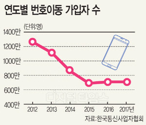 [디지털타임스 강은성 기자]지난해 휴대전화 번호이동 가입자가 701만여명으로 집계됐다. 2013년 1116만명을 넘는 등 번호이동이 뜨거웠던 것에 비하면 30% 이상 감소한 수준이다.