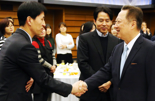 박용만 대한상공회의소 회장(오른쪽)이 2일 오전 서울 중구 대한상의회관에서 열린 2018년 대한상공회의소 시무식에서 직원과 악수하고 있다.