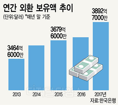 한국은행이 4일 발표한 '2017년 12월 말 외환보유액'을 보면 지난해 12월 말 한국의 외환보유액은 3892억7000만달러로 전월 대비 20억2000만달러 증가했다.