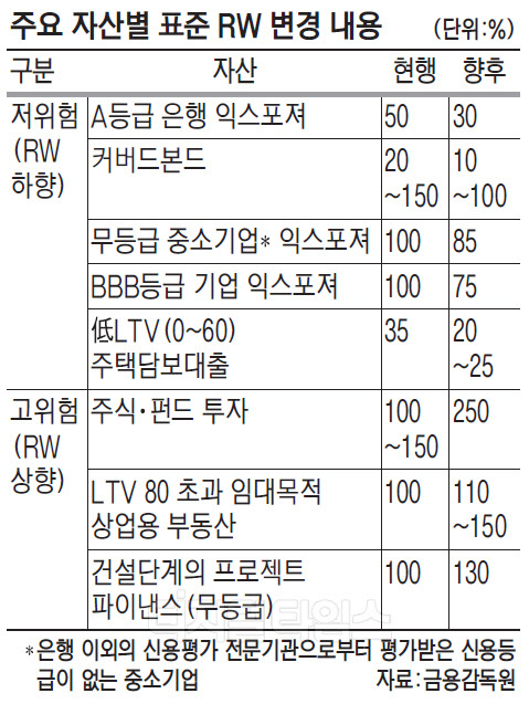 2022년 1월부터 본격 시행되는 바젤Ⅲ는 은행의 자본을 규제할 때 자산의 신용위험 측정 방법을 차등화하는 내용을 핵심으로 하고 있다. 예를 들어 주택담보대출에 위험가중치(RW)를 35%로 일괄 적용하던 것을 담보인정비율(LTV) 수준에 따라 20~70%로 차등 적용한다. 또 주식이나 펀드투자, 부동산PF 등 고위험 자산의 경우 위험가중치를 강화한다.