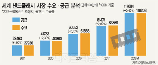 4일 시장조사업체 D램익스체인지와 업계에 따르면 삼성전자와 SK하이닉스, 도시바, 인텔, 중국 칭와유니그룹의 자회사인 양쯔 메모리테크놀로지컴퍼니(YMTC) 등이 2019년을 전후해 낸드플래시 생산량을 늘리면서 공급과잉이 시작될 것으로 보고 있다.