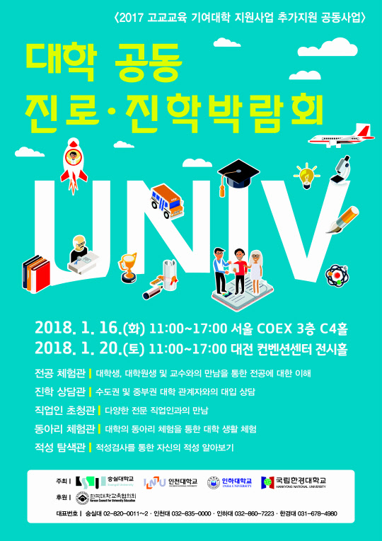 이번 박람회는 원스톱 서비스를 통해 ▲전공체험관 ▲진학상담관 ▲직업인초청강연관 ▲적성탐색관 ▲동아리체험관 등 다양한 정보를 한 곳에서 대학이 직접 제공하며 중·고등학생이 관심 분야에 대해 탐색할 수 있게 해 진로 설계에 도움을 줄 예정이다.