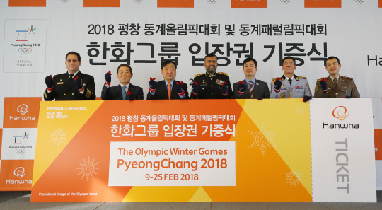 4일 오전 서울 중구 더플라자호텔에서 '2018 평창 동계올림픽대회 및 동계패럴림픽대회 한화그룹 입장권 기증식'이 열렸다. 페루 리카르도 해군대령,(왼쪽부터) 이태종 ㈜한화 대표이사, 이희범 조직위원장, 파키스탄 알리 육군중령, 김주호 조직위 기업홍보부위원장, 몽골 바닛 육군대령, 키르기스스탄 카즈벡 육군중령 입장권을 들고 핑거하트를 만들며 기념 촬영하고 있다.