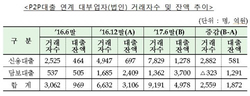 P2P 연계 대부업자는 지난해 6월말 기준 86개로 1년전인 2016년 6월 말의 33개보다 배 이상으로 늘었다.