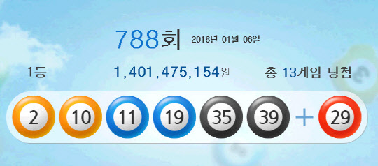 당첨번호 6개를 모두 맞힌 1등 당첨자는 13명으로 14억147만5천154원씩 받는다.