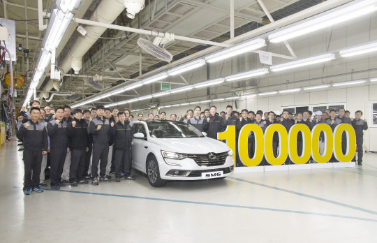 르노삼성자동차가 지난 2016년 3월 출시한 SM6의 판매량이 22개월 만에 10만대를 돌파했다고 7일 밝혔다. 이는 회사가 내수에서 판매 중인 차량 가운데 역대 두 번째로 짧은 기간 내 10만대를 돌파한 것이다. 역대 최고 기록은 SM5가 세운 19개월이다. 사진은 르노삼성자동차 임직원이 SM6 생산 10만대 달성을 기념해 차량과 함께 기념촬영을 하고 있는 모습.