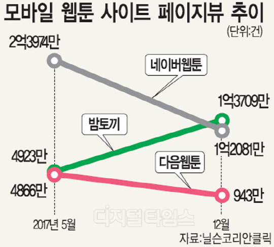 [디지털타임스 진현진 기자]대만·홍콩 박스오피스 1위, 국내 1200만 관객 동원. 국내외에서 기록적인 흥행역사를 쓰고 있는 영화 '신과함께'는 주호민 작가의 동명 웹툰이 원작이다. 2012년 완결된 작품이지만, 최근까지도 웹툰 유료판매로만 월 1000만원 이상의 매출을 거둬들이고 있다. 이런 콘텐츠 산업의 '보물'인 웹툰이 불법 유통 사이트에 의해 도둑질 당하고 있다. 불법 사이트의 트래픽이 포털 웹툰 플랫폼을 위협하는 수준까지 치솟았다. 14일 업계에 따르면 불법 웹툰 유통 사이트 '밤토끼'의 트래픽이 카카오의 웹툰 서비스 '다음웹툰'을 위협하고 있다. 밤토끼는 2016년 말에 생긴 사이트로 국내에만 200여개의 불법 사이트를 등장시킨 주범으로 지목되고 있다. 닐슨코리안클릭의 집계를 보면 지난해 11월 밤토끼의 모바일 웹 월간 순방문자수는 51만6641명으로 41만7447명을 기록한 다음웹툰을 넘었다. 한 달이지만 밤토끼가 다음웹툰을 추월한 것이다. 밤토끼의 순방문자수는 지난해 초부터 꾸준히 늘었는데, 지난해 5월 약 25만명 수준이던 순방문자는 지난해 12월 51만8721명으로 집계됐다. 이는 12월 51만9124명의 순방문자 수를 기록한 다음웹툰보다 단 403명 적다.