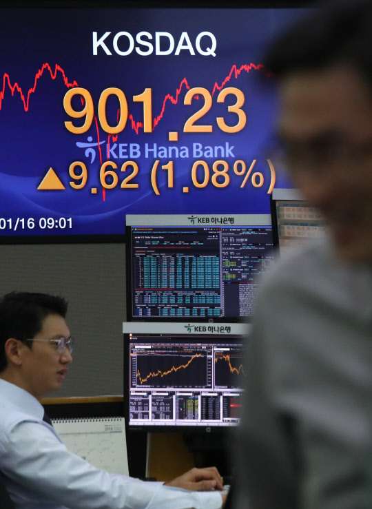 지수가 지난 2002년 3월 이후 16년 만에 900선을 돌파하며 대기록을 썼다. 코스닥 시장은 이날 기관은 물론 외국인들이 모두 매수에 나서면서 전날 보다 9.62포인트(1.08%) 오른 901.23으로 마감했다. 이날 오후 서울 중구 을지로 KEB하나은행 본점 딜링룸에서 딜러들이 이야기 하고 있다.