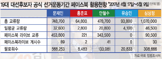 반면 공식 선거기간 중 페이스북 라이브의 게시 수에서는 문 후보가 89건으로 안 후보(41건), 심 후보(30건), 홍 후보(2건), 유 후보(0건)을 크게 앞섰고 문 후보는 라이브교류량에서도 45만회로 다른 후보들을 압도했습니다.