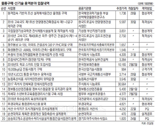 신기술·서비스 용역에서 정보통신산업진흥원의 '정보시스템 운영 및 유지관리용역사업'은 54억원 규모로, 협상계약으로 다음달 1일 개찰한다. 또 국방부 국군지휘통신사령부의 'KJCCS 통합 유지보수 용역사업'과 농림축산식품부의 '농림축산식품 사이버안전센터 위탁운영사업'은 각각 37억1400만원, 35억4500만원 규모로 협상계약으로 진행된다.