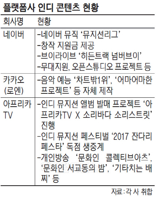 29일 업계에 따르면 국내 대표 인터넷 서비스 업체들은 인디 아티스트들을 지원하고 이들을 소개하는 콘텐츠를 활발히 제작하고 있다.