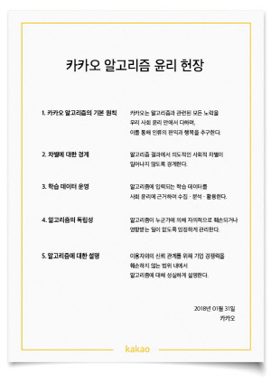 카카오 알고리즘 윤리 헌장에는 인류의 편익과 행복을 추구하는 카카오 AI 기술의 지향점, 결과의 의도적 차별성 방지, 윤리에 근거한 학습 데이터·수집 관리 원칙 등이 담겨 있다. 알고리즘 관리의 독립성과 알고리즘에 대한 설명 방침도 포함돼 있다.