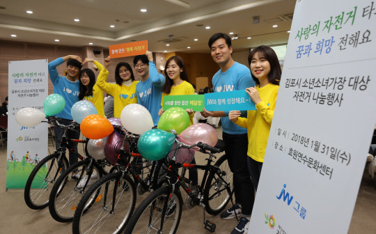 JW그룹 신입사원들이 1월 31일 경기도 김포시 효원문화연수센터에서 열린 김포지역 소년소녀가장 대상 자전거 나눔행사에서 조립한 자전거를 앞에 두고 그룹의 사회공헌 표어를 들어보이고 있다.