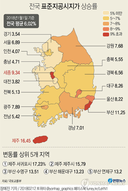이어 부산(11.25%), 세종(9.34%), 대구(8.26%)의 순으로 공시지가 상승률이 높았다.