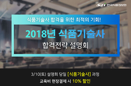 이번 식품기술사 설명회는 10시 서울교육장, 15시 대전교육장에서 각각 2시간씩 진행되며 참석자는 한국식품정보원 식품기술사 자격취득 과정 교육비의 10%를 할인받을 수 있다.