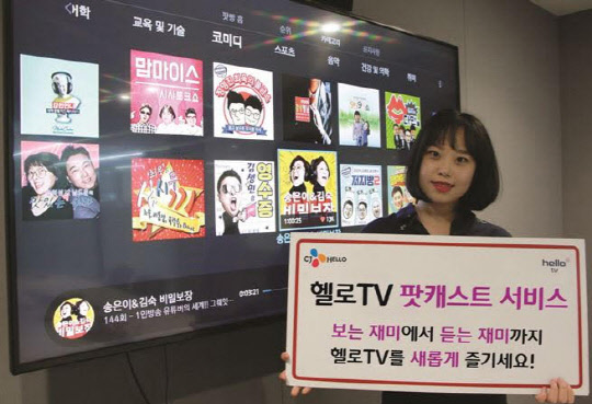 헬로TV를 통해 방송 콘텐츠뿐만 아니라 김생민의 '영수증', 송은이&김숙의 '비밀보장' 등 차별화된 오디오 콘텐츠까지 지원한다. 내가 원하는 팟캐스트의 에피소드를 언제든지 이용할 수 있어 TV를 통한 콘텐츠 선택의 폭이 더욱 넓어진다. 헬로TV 팟캐스트는 팟빵이 가진 1만여개의 방송코너와 약 84만건의 에피소드를 제공한다. 정치 시사 취미 코미디 등 20여개의 카테고리로 구성된 다양한 콘텐츠들을 매일 업로드하며, 전체 팟캐스트 순위 정보와 인기 추천방송도 한 눈에 볼 수 있다.