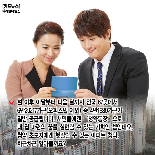 2. 설 이후 이달부터 다음 달까지 전국 67곳에서 6만29217가구(오피스텔 제외) 중 4만1689가구가 일반 공급됩니다. 서민들에겐 '청약통장'으로 내 집 마련의 꿈을 실현할 수 있는 기회인 셈인데요. 청약 초보자에겐 헷갈릴 수 있는 아파트 청약, 차근차근 알아볼까요?