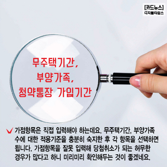 4. 가점항목은 직접 입력해야 하는데요. 무주택기간, 부양가족 수에 대한 적용기준을 충분히 숙지한 후 각 항목을 선택하면 됩니다. 가점항목을 잘못 입력해 당첨취소가 되는 허무한 경우가 많다고 하니 미리미리 확인해두는 것이 좋겠네요.