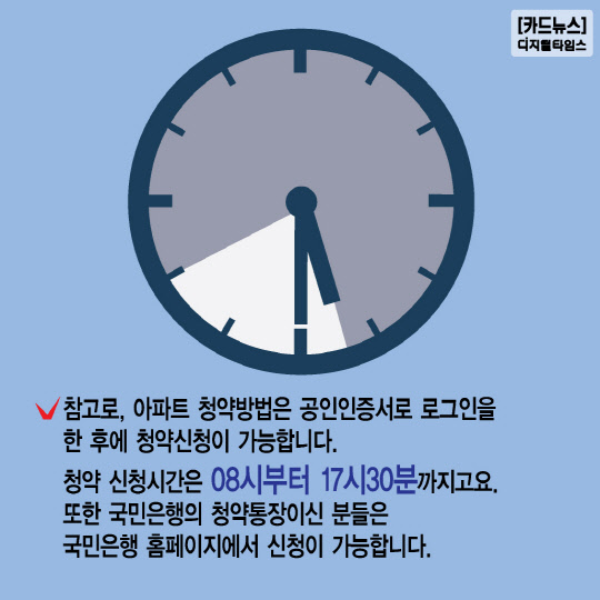 5. 참고로, 아파트 청약방법은 공인인증서로 로그인을 한 후에 청약신청이 가능합니다. 청약 신청시간은 08시부터 17시30분까지고요. 또한 국민은행의 청약통장이신 분들은 국민은행 홈페이지에서 신청이 가능합니다.