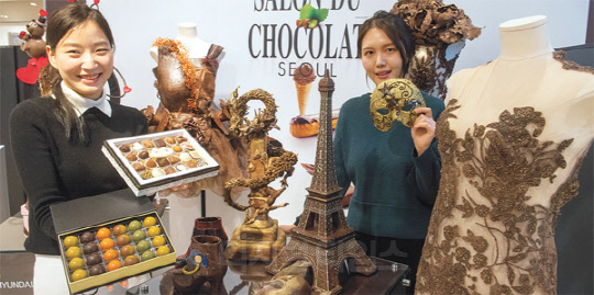 현대백화점이 밸런타인데이를 앞두고 오는 14일까지 서울 압구정본점 5층 대행사장에서 초콜릿 박람회 '살롱 뒤 쇼콜라 서울: 에필로그'를 진행한다. 12일 압구정본점 5층 대행사장에서 현대백화점 직원들이 초콜릿 드레스와 공예품을 선보이고 있다.