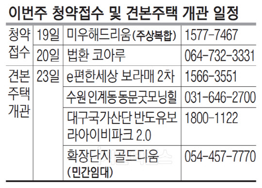 같은 날 동문건설은 수원 인계동에서 수원 인계동 동문굿모닝힐 견본주택을 개관한다. 단지는 지하 2층∼지상 33층, 전용 63∼79㎡, 298가구다. 단지 바로 앞에 인계3호공원이 있으며 도보 15분 거리에 수원매화초를 비롯해 유신고, 아주대 등이 자리 잡고 있다.