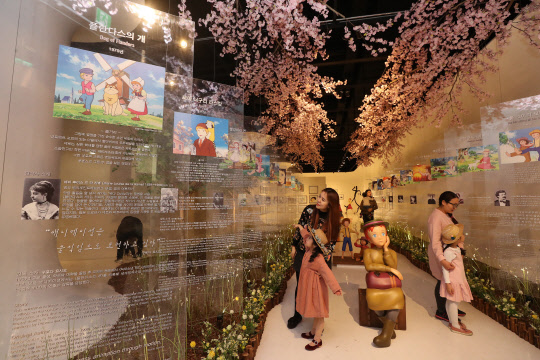 18일 오전 서울 용산구 아이파크몰 팝콘D스퀘어에서 어린이를 동반한 가족들이 '세계명작극장전, 빨강머리 앤, 파트라슈 그리고 40년의 추억' 전시장을 둘러보고 있다. '빨강머리 앤', '플란다스의 개' 등 고전 명작 만화를 테마로 기획된 이번 전시는 만화 속 주인공들의 실제 사이즈 조형물과 레이아웃 스케치, 원화 등 애니메이션 시리즈를 한 눈에 감상할 수 있다.