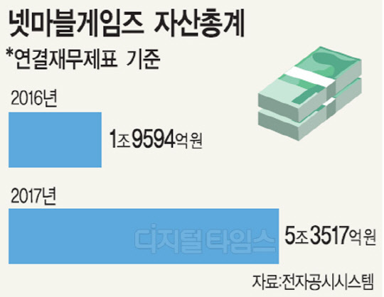넷마블은 지난해 연결 재무제표 기준으로 자산 총계가 약 5조3517억원만원에 달했다. 이는 전년보다 3조여원, 173% 증가한 수준이다. 작년 5월 코스피에 상장하면서 2조6617억원의 자금을 조달했고, 같은 해 2월 약 8000억원을 들여 북미 개발사 카밤을 인수해 자회사로 편입하면서 자산이 크게 늘었다.