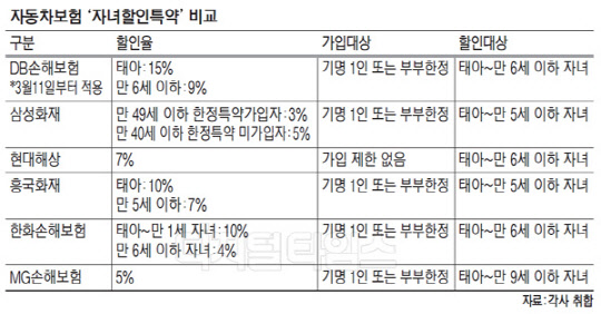 손해보험사 관계자는 "어린 자녀가 있는 차량은 저속·안전 운전을 하고 교통법규도 상대적으로 잘 지키는 것으로 나타났다"며 "자녀할인 특약을 활용해 양질의 고객을 확보할 수 있다"고 설명했다.