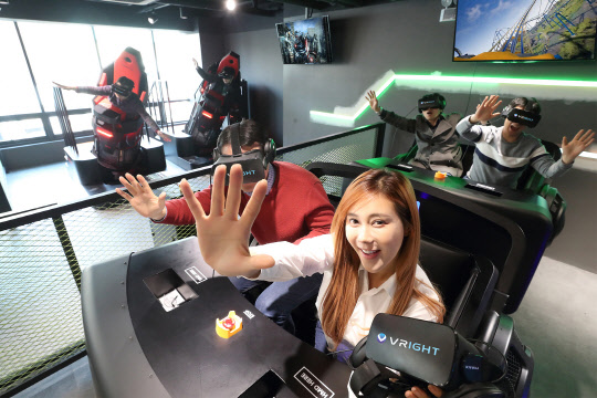 KT는 GS리테일과 내달 초 서울 신촌에 도심형 가상현실(VR) 테마파크 '브라이트(VRIGHT)'를 공동 개관한다고 20일 밝혔다. 브라이트에서는 1인칭 VR 슈팅게임 '스페셜포스 VR: 유니버셜 워'와 '플라잉 제트' 등 약 50여 종의 VR콘텐츠를 선보일 예정이다. 사진은 오는 3월 개관 예정인 브라이트에서 모델들이 VR 게임 기기들을 시연하는 모습.