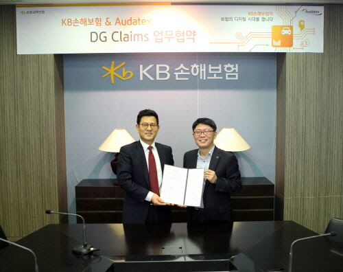 KB손해보험은 서울 강남구 본사에서 자동차 수리업체 아우다텍스와 업무 양해각서(MOU)를 체결했다. 이평로 KB손보 자동차보험부문장 상무(오른쪽)와 정수천 아우다텍스코리아 한국지사장이 업무협약을 체결한 후 기념촬영을 하고 있다.