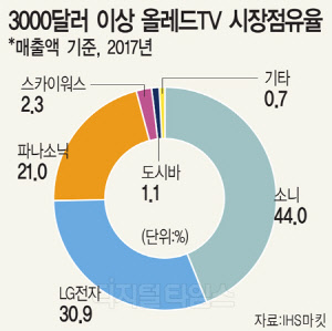 20일 시장조사업체 IHS마킷에 따르면 세계 OLED TV 시장의 약 3분의1을 차지하는 3000달러 이상 '초고가' 제품 점유율에서 소니가 지난해 44%로 처음으로 1위에 올랐다.