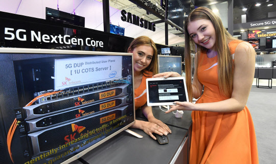26일(현지시간) 스페인 바르셀로나에서 개막한 세계 최대 모바일 전시회 '모바일 월드 콩그레스(MWC) 2018' 전시장 내 SK텔레콤 부스에서 현지모델들이 세계 최초 5G NSA(Non-Standalone) 표준 기반 무선 전송 기술 등을 선보이고 있다. SK텔레콤은 26일부터 나흘간 열리는 모바일 월드 콩그레스에 참가해 '완벽한 5G(Perfect 5G)'를 주제로 5G 네트워크 기술과 서비스를 소개한다.