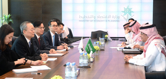백운규 산업통상자원부 장관은 12일(현지시간) 알팔레 사우디아라비아 에너지산업광물자원부 장관 등 정부 관계자들을 만나 한국 정부의 사우디 원자력발전소 건설 수주 의지를 전달하고, 양국 간 원전 협력방안을 논의했다. 백 장관(왼쪽 두 번째) 등 우리 측 정부 관계자들이 알 투와즈리 경제기획부 장관(맨오른쪽) 측과 면담하고 있다.