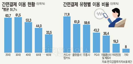 15일 한국금융투자자보호재단이 지난해 12월 서울과 수도권 및 6대 광역시에 거주하는 만 25~64세 일반인 2530명을 대상으로 핀테크 이용현황을 조사한 결과, 전체응답자의 51.7%가 간편결제 서비스를 이용하고 있다고 답했다.