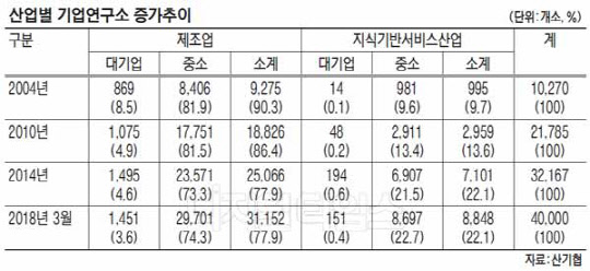 기업연구소는 1981년 53개를 시작으로 2004년 1만 개를 넘어섰고, 2010년 2만 개, 2014년 3만 개를 돌파하며 증가세를 이어가고 있다. 2004년과 비교해 대기업 연구소는 883개에서 1602개로 1.8배 늘었으며, 중소기업은 9387개에서 3만8398개로 4배 이상 늘었다.