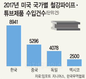 19일 한국무역협회와 무역데이터 제공업체 임포트지니어스에 따르면 2017년 미국의 철강 파이프(강관)와 튜브 수입액 가운데 20%는 한국산인 것으로 조사됐다. 작년 한국의 철강 파이프와 튜브의 미국 수출물량은 약 160만 톤으로, 금액으로는 약 16억 달러(1조7000억원)에 이른다. 건수로는 8941건으로 단일 국가 중에서는 가장 많다. 중국이 5296건, 독일이 4078건, 멕시코가 2500건 등으로 뒤를 이었다.